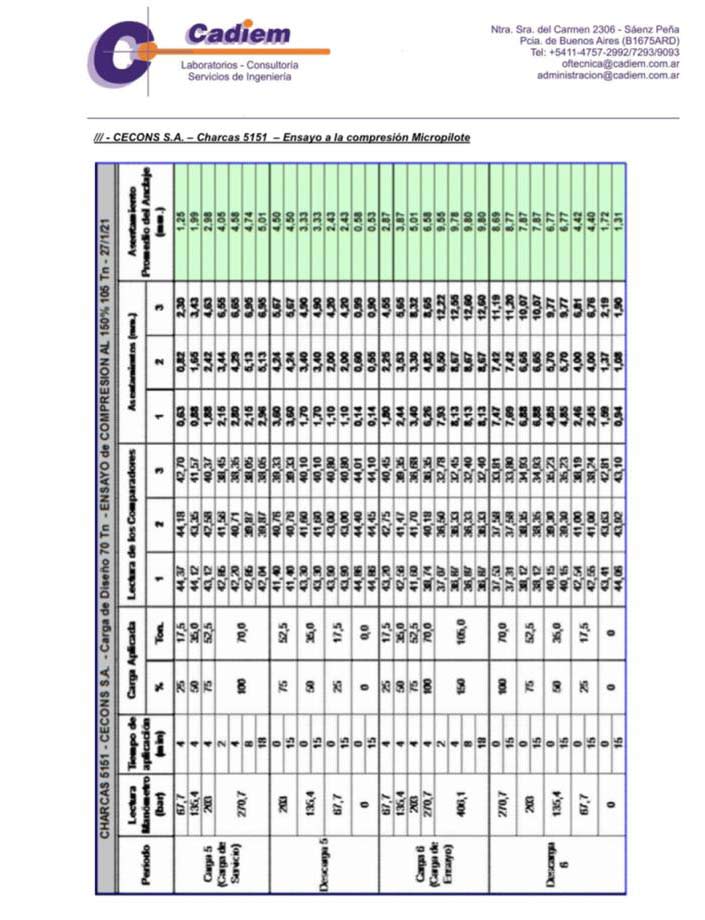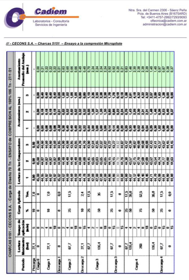 El micropilote diseñado para 70 toneladas fue llevado a una carga máxima de 105 toneladas.